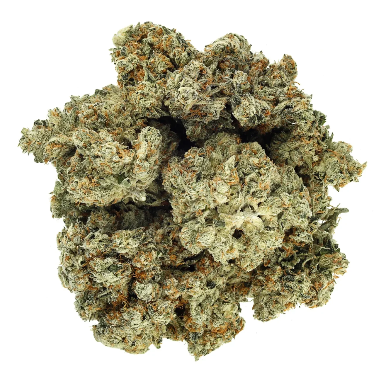 Appearance: Dense, diamond-shaped forest green nugs with deep purple undertones, thin red-orange hairs, and a frosty coating of bright white crystal trichomes