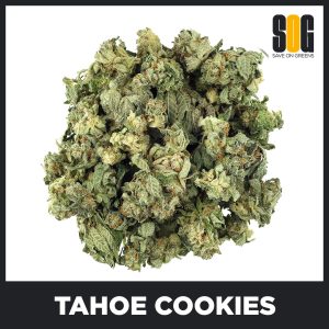 Tahoe Cookies is an Indica-dominant Hybrid strain with a high THC level of 29%. It has green nuggets with dark hairs and small white trichomes that look almost purple. The price for Tahoe Cookies starts at 30 CAD for 3.5g.